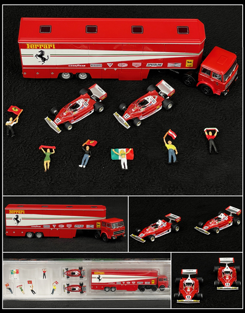 NEW Set of 2 Ferrari 312 T2 F1 1977 + Transporter Fiat 691 T & 6 Figures - 1 : 87
