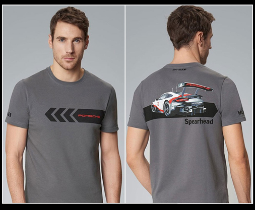 T-shirt Porsche 911 RSR - Motorsport Racing Fan Inscription Porsche sur la poitrine Motif 911 Spearhead au dos Couleur gris / noir Matière: 100% coton Mixte - Porsche Design WAP453 39,95 € TTC / Incl. Taxes
