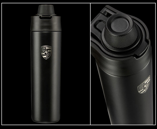 Bouteille Isotherme Porsche Dimensions 8 x 7 x 2,6 cm - En acier inoxydable à double paroi - Couvercle étanche Poignée de transport repliable - Contenance 550 ml - Couleur Noir Porsche WAP0508100T0PB 49,95 € TTC / Incl. Taxes