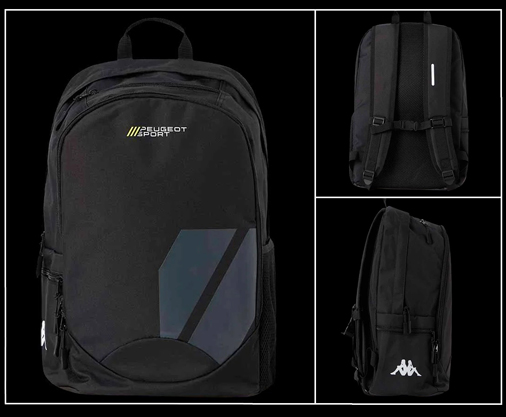 Sac à dos Peugeot Sport Grand compartiment principal zippé - Matière 100% Polyester - Couleur Noir Bretelles réglables - Dos rembourré Kappa 38238QW-A03 49,95 € TTC / Incl. Taxes
