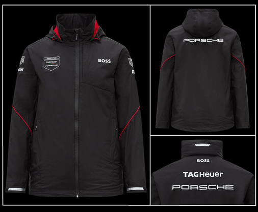 Veste homme Porsche Motorsport BOSS Tag Heuer Imperméable, confortable et respirante - Matière 100% polyester - Couleur noir / blanc / rouge 2 grandes poches zippées - 1 poche intérieure zippée 249,95 € TTC / Incl. Taxes