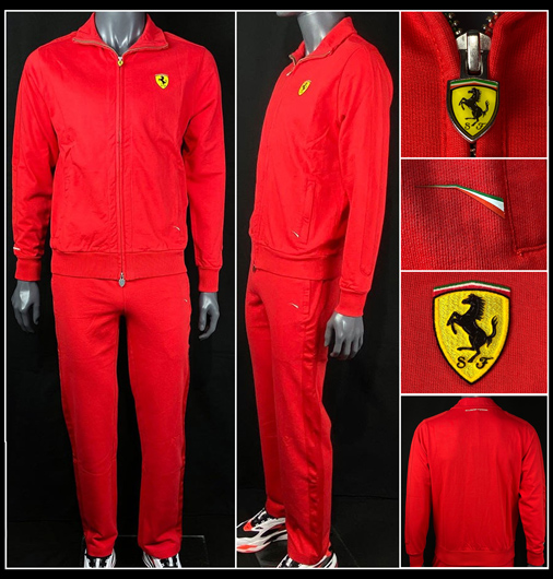 Survêtement homme Ferrari Rosso Corsa Ensemble jogging veste + pantalon Softshell Veste col droit / Bords côtes / fermeture par Zip - Couleur Rouge Divers empiècements micro aérés - Pantalon taille élastiquée + cordon 2 poches zippées sur veste et pantalon - Matière 100% Coton