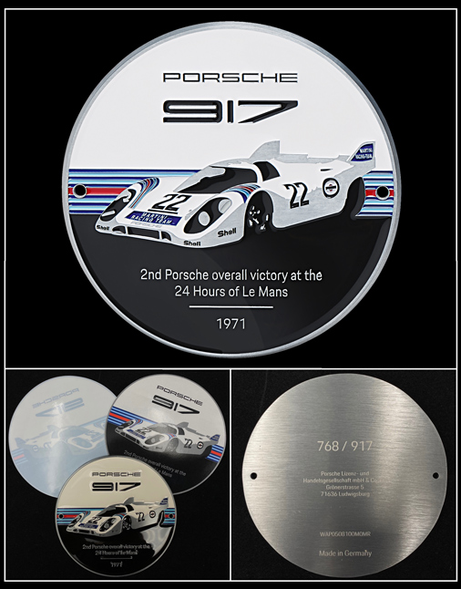 Badge de Grille Porsche 917 Martini n°22 - Vainqueur 24h du Mans 1971 Anniversaire de la victoire Porsche aux 24h du Mans 1971 Fabriqué en métal - Diamètre 9 cm - Kit de fixation inclus Inclus 1 autocollant pour l'extérieur, 1 autocollant pour l'intérieur des vitres Couleur blanc / noir / bleu / rouge - Edition limitée 917 exemplaires numérotés Made in Germany - Porsche WAP0508100M0MR 99,95 € TTC / Incl. Taxes