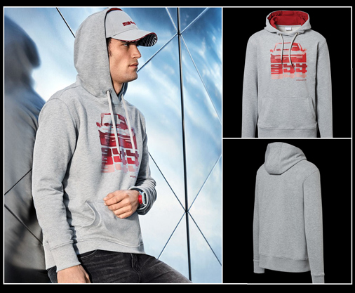 Sweatshirt à capuche Porsche 944 Logo Porsche 944 Gambiarot devant - Grande poche devant avec 2 entrées latérales Capuche avec lacet - Bords côtes - Couleur gris clair / rouge Matière 65% Coton / 35% Polyester Porsche Design WAP423K