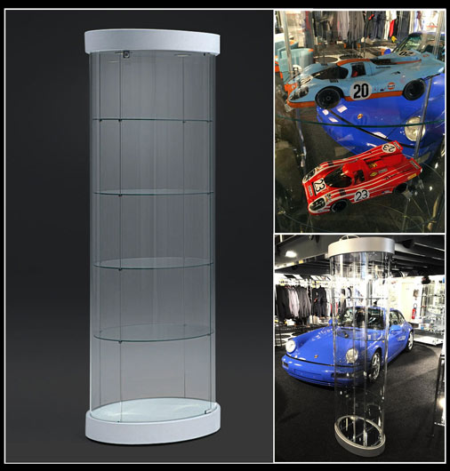 Vitrine ovale 360 degrés pour miniatures 1/12 Jusqu'à 5 miniatures Porsche à l'échelle 1/12 - 4 étagères réglables en hauteur Cotés vitrés verre courbé - 4 étagères / 5 niveaux de présentation - Eclairage par LED Verre Securit 6mm - 1 serrure - Dimensions 189 x 63 x 43 cm 1799,95 € TTC / Incl. Taxes