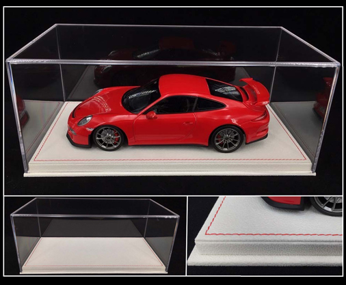 Boite Vitrine Premium pour miniature 1 : 18 Base Alcantara Beige avec surpiqûre Rouge - 32,3 x 13,5 x 16,8 cm Matière Acrylique anti-rayures 3 mm Miniature vendue séparement 49,95 € TTC / Incl. Taxes
