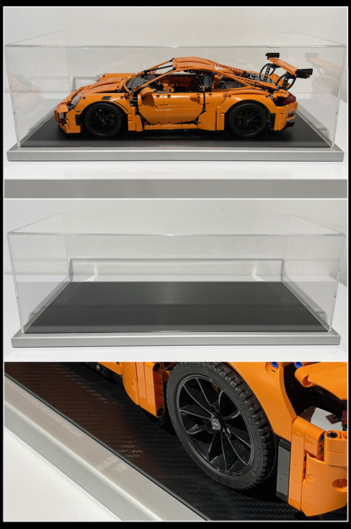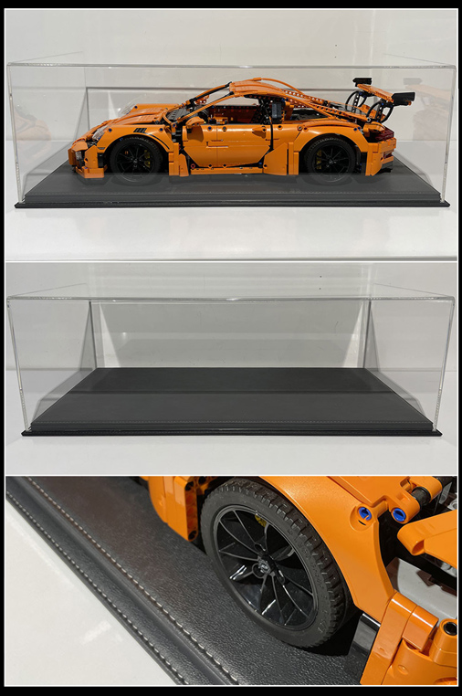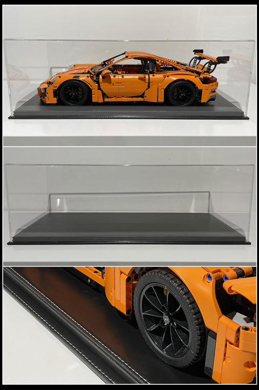Vitrine pour Lego 42056 / 42096 / 42115 / 42083 Base simili cuir Noir avec surpiqûre Blanche - Convient également pour 3 modèles 1/18 65 x 21 x 31 cm - Matière Acrylique anti-rayures 3,5 mm Miniature vendue séparement 179,95 € TTC / Incl. Taxes