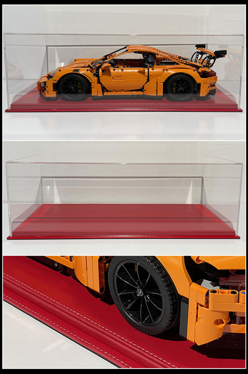 Vitrine pour Lego 42056 / 42096 / 42115 / 42083 Base simili cuir Rouge avec surpiqûre Blanche - Convient également pour 3 modèles 1/18 65 x 21 x 31 cm - Matière Acrylique anti-rayures 3,5 mm Miniature vendue séparement 179,95 € TTC / Incl. Taxes