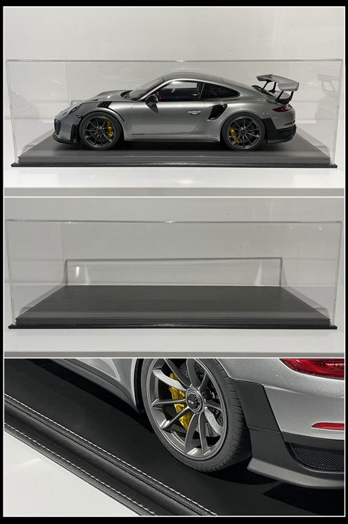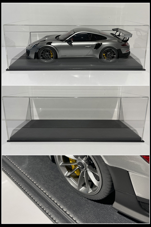 Boite Vitrine Premium pour miniature 1 : 18 Base simili cuir Gris avec surpiqûre Grise - 32,3 x 13,5 x 16,8 cm Matière Acrylique anti-rayures 3 mm Miniature vendue séparement 49,95 € TTC / Incl. Taxes