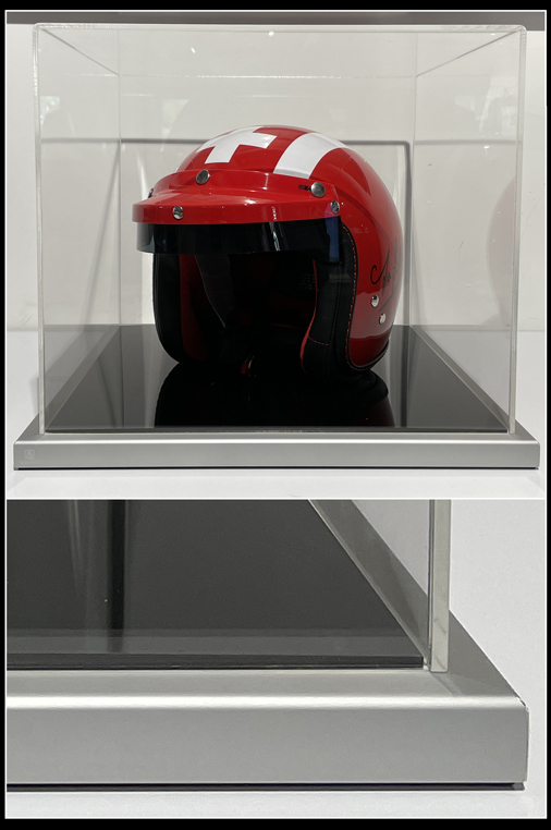 Vitrine pour pour Casque de Course Base cadre metal / fond Acrylique 38 x 31 x 37 cm - Matière Acrylique anti-rayures 3,5 mm Casque vendu séparement 119,95 € TTC / Incl. Taxes