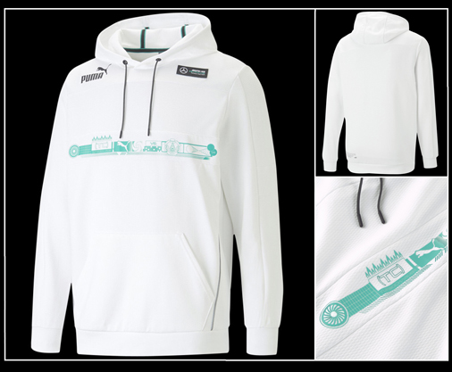 Hoodie homme Mercedes-AMG F1 by Puma Capuche réglable par cordon de serrage - Poche kangourou Matière 70% polyester / 30% coton - Couleur Blanc Puma 538449-01