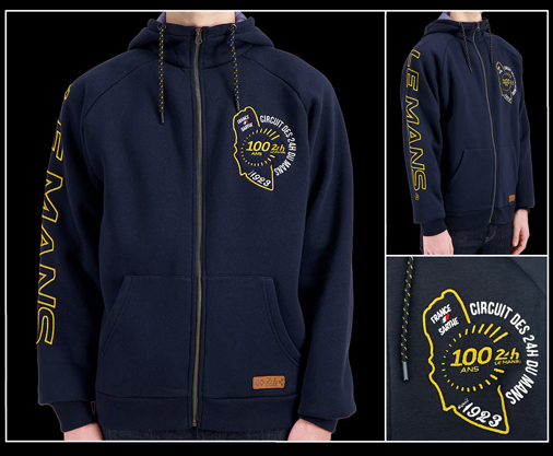 Hoodie homme 24h Le Mans 100 Ans Fermeture principale zippée - Capuche réglable par cordon de serrage Matière 100% coton - Couleur Bleu Marine - 2 poches latérales Le Mans LM231SSM02-100 119,95 € TTC / Incl. Taxes