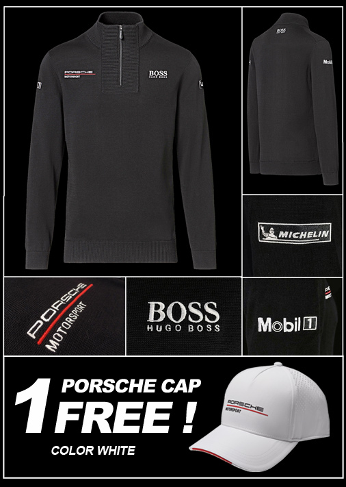 Pull Mixte Porsche Motorsport Hugo Boss Col montant avec fermeture éclair - tirette marquée Porsche - Couleur Noir Matière 100 % Coton / Col et bords 8% Polyamide - Maille légère et bords côtes Logos brodés Porsche et Hugo Boss sur poitrine et cou Logos brodés Mobil1 et Michelin sur manches Porsche WAP121MMSR