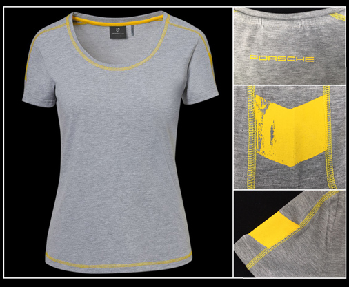 T-shirt femme Porsche GT4 Clubsport Couleur gris chiné / jaune - Inscription Porsche au dos Matière 69% polyester / 27% coton / 4% élasthanne Porsche WAP341LCLS
