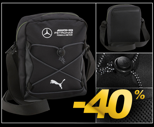 Sacoche Mercedes-AMG F1 Matière 100% polyester - Dimensions 15,5 x 6,5 x 21 cm - Bandoulière réglable Couleur Noir - Compartiment principal avec séparation et fermeture par zip Puma 090399-01