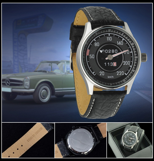 Montre compteur de vitesse Inspiration Mercedes-Benz 280 SL - 220 km/h Mouvement quartz Miyota Japan - Bracelet cuir noir / surpiqures blanches Boitier en acier - Verre plat - Fond vissé - Diamètre 41 mm - Epaisseur 10 mm Bracelet 22 mm - Etanche 10 ATM / 100m - Livré dans sa boite de présentation en cuir Made in Germany 159,95 € TTC / Incl. Taxes