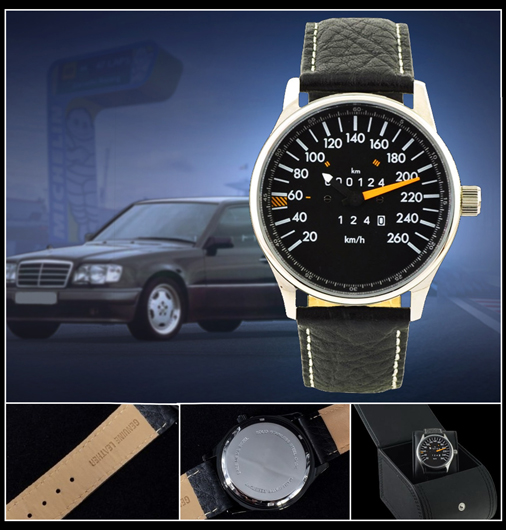Montre compteur de vitesse Inspiration Mercedes-Benz W124 - 260 km/h Mouvement quartz Miyota Japan - Bracelet cuir noir / surpiqures blanches Boitier en acier - Verre plat - Fond vissé - Diamètre 41 mm - Epaisseur 10 mm Bracelet 22 mm - Etanche 10 ATM / 100m - Livré dans sa boite de présentation en cuir Made in Germany 159,95 € TTC / Incl. Taxes