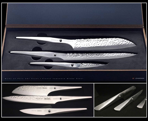 Coffret 3 Couteaux Porsche Design Type 301 HM 1 santoku (P02HM) - 1 couteau à découper (P05HM) - 1 couteau d'office (P09HM) Acier japonais 0.7% de carbone + molybdène vanadium - Martelage anti-adherent de la lame Manche ergonomique en inox - Aiguisage ambidextre Design exclusif issu du Studio F. A. Porsche Chroma P529HM - Garantie 5 ans 249,95 € TTC / Incl. Taxes