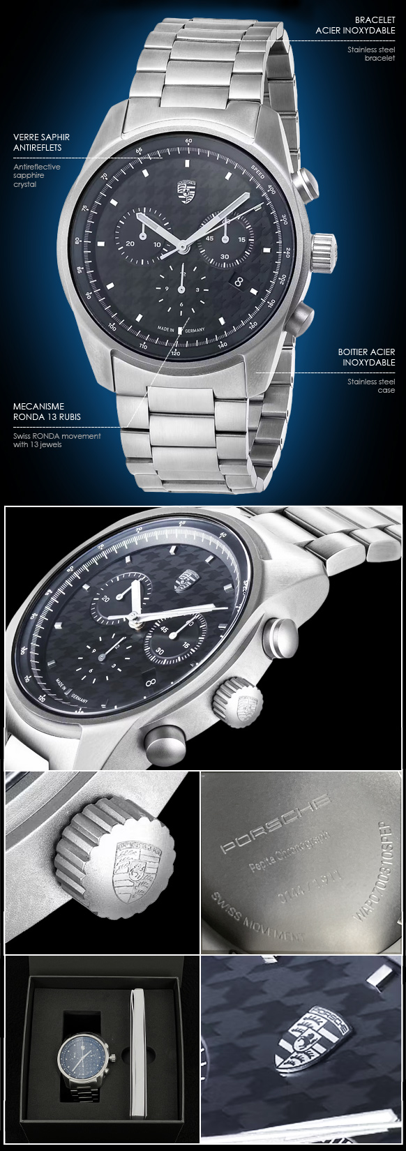 Montre Chronographe Porsche Pepita Mouvement Suisse Ronda 13 rubis - Boîtier & Bracelet en acier inoxydable Aiguilles luminescentes - Dos gravé avec numéro de série - Etanche à 100 mètres / 10 ATM Verre saphir antireflet simple face - Fermoir papillon - Fonctions date, chronographe Couleur Gris argent / Noir - Diamètre 42 mm - Epaisseur 12 mm - Garantie 2 ans Porsche WAP0700310SPEP Edition Limitée - 1911 exemplaires numérotés 699,95 € TTC / Incl. Taxes