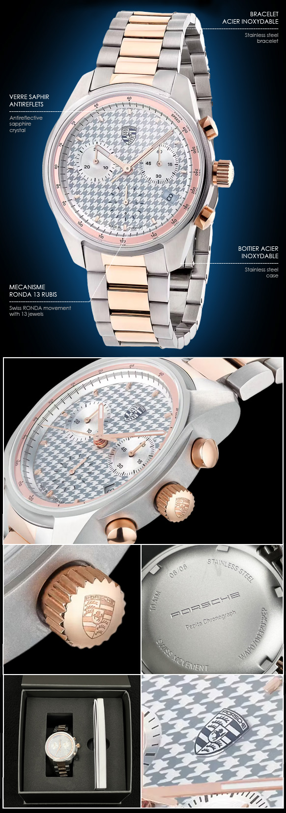Montre Chronographe Porsche Pepita Mouvement Suisse Ronda 13 rubis - Boîtier & Bracelet en acier inoxydable Aiguilles luminescentes - Dos gravé avec numéro de série - Etanche à 100 mètres / 10 ATM Verre saphir antireflet simple face - Fermoir papillon - Fonctions date, chronographe Couleur Gris argent / Rose - Diamètre 42 mm - Epaisseur 12 mm - Garantie 2 ans Porsche WAP0700320SPEP 699,95 € TTC / Incl. Taxes