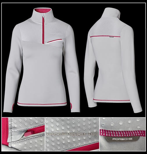T-shirt manches longues femme Porsche Sport - Tailles S / XL seulement Couleur gris / rose - Matière 90% Polyester / 10% Elasthane Col montant et fermable par zip - 1 poche poitrine zippée Porsche WAP537M0SP 99,95 € TTC / Incl. Taxes