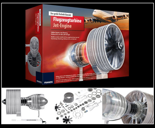 Moteur d'avion à réaction Boeing Airbus en kit - Réplique entièrement fonctionnelle 60 pièces à monter soi-même Pièces transparentes pour voir le mouvement Superbe manuel de 56 pages illustré en anglais et allemand Fonctionne avec 3 piles AAA