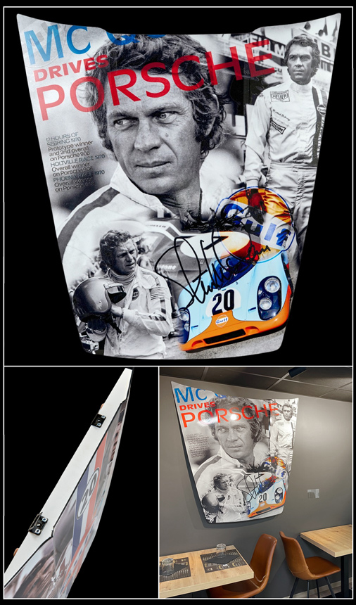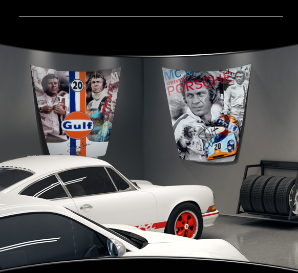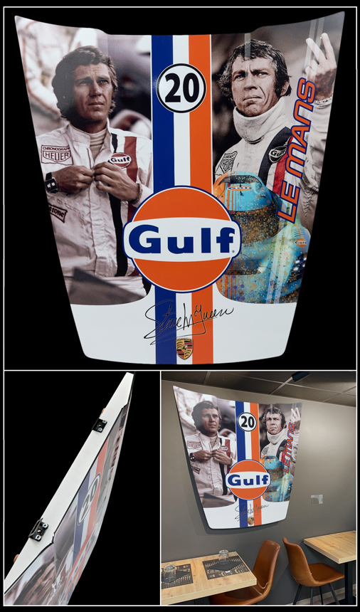 Décoration Murale en forme de capot Gulf Steve McQueen Dimensions 121 x 126 cm - Matériau Aluminium Dibond Fixation facile par pattes métalliques sur le dessus 599,95 € TTC / Incl. Taxes