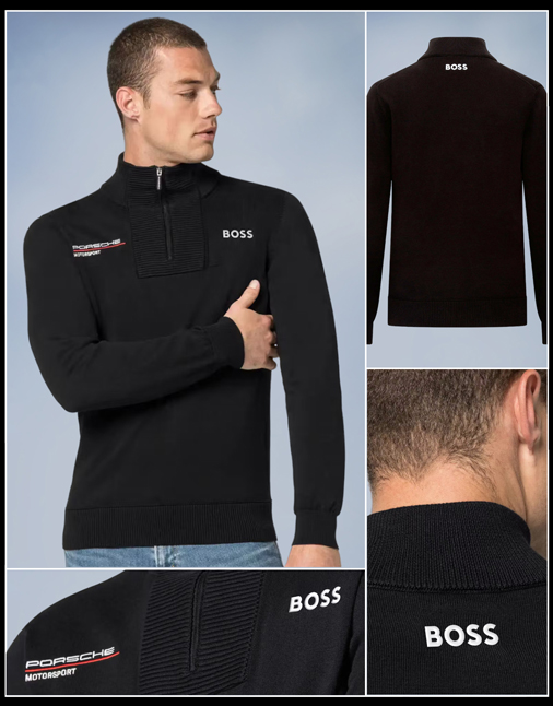 Pull Mixte Porsche x BOSS Col montant avec fermeture éclair - tirette marquée Porsche - Couleur Noir Matière 100 % Coton / Col et bords 8% Polyamide - Maille légère et bords côtes Logos brodés Porsche et BOSS sur poitrine et cou Logos brodés Mobil1, ABB et Tag Heuer sur manches Porsche WAP121PMSR 169,95 € TTC / Incl. Taxes