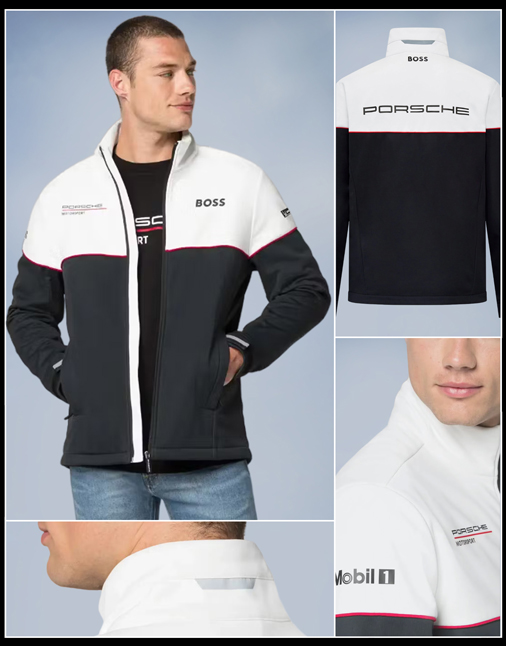 Veste homme Porsche x BOSS Imperméable, confortable et respirante - Veste coupe-vent softshell coupe droite Couleur noir / blanc / détails rouge - Matière 100% polyester 2 grandes poches et 1 poche intérieure zippées Avec kit d'accessoires Porsche Motorsport Porsche Design WAP435P0MS 249,95 € TTC / Incl. Taxes