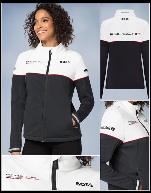 Veste femme Porsche x BOSS Imperméable, confortable et respirante - Veste coupe-vent softshell coupe droite Couleur noir / blanc / détails rouge - Matière 100% polyester 2 grandes poches et 1 poche intérieure zippées Avec kit d'accessoires Porsche Motorsport Porsche Design WAP4360P0MS 249,95 € TTC / Incl. Taxes