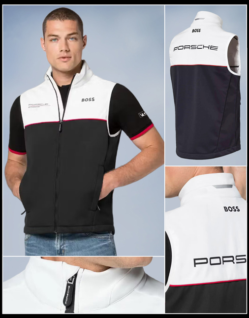 Veste sans manches mixte Porsche x BOSS Matière 100% polyester - Couleur Noir / Blanc / Détails Rouge - Fermeture zippée 2 grandes poches zippées - 1 poche intérieure zippée Porsche WAP430P0MS 179,95 € TTC / Incl. Taxes