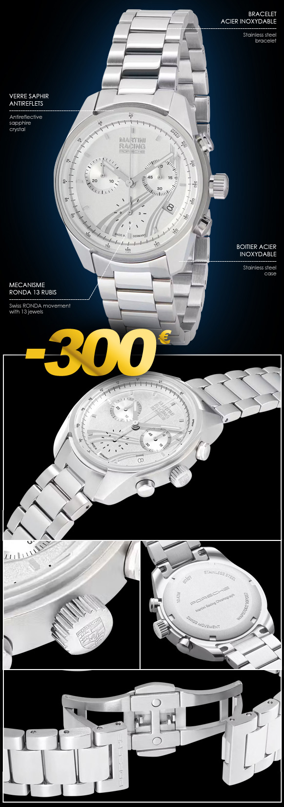Montre Porsche Chrono Sport Martini Racing Mouvement Suisse RONDA 13 rubis - Bracelet en acier inoxydable avec liens brossés et polis Aiguilles luminescentes - Dos gravé avec numéro de série - Etanche à 100 mètres / 10 ATM Bracelet en acier inoxydable - Verre antireflets saphir - Fonction Stop intégrée Montage du bracelet et réglage de la longueur par deux goupilles à ressort Diamètre 37 mm - Epaisseur 12 mm - Garantie 2 ans Fabriqué en Allemagne - Porsche WAP0700210P037