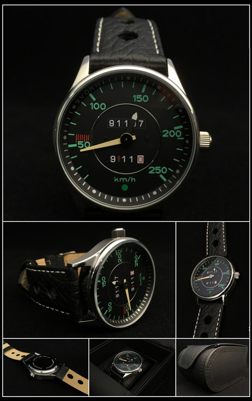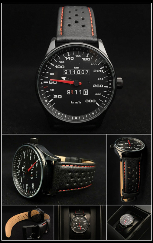 Montre Compteur de vitesse Porsche 911 - 300 km/h Mouvement quartz Miyota Japan - Verre plat - Fond vissé Bracelet perforé en cuir noir / surpiqué rouge Boitier en acier inoxydable noir - Etanche 10 ATM / 100 m Diamètre 41 mm - Epaisseur 10 mm - Made in Germany 159,95 € TTC / Incl. Taxes