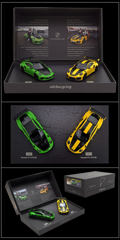 Record Set Nürburgring 2018 991 GT2 RS - Tour en 6.47,3 minutes le 20.09.2017 991 GT3 RS Phase II - Tour en 6.56,4 minutes le 16.04.2018 Jaune Racing / Vert lézard 1/43 - Spark WAX02020087 159,95 € TTC / Incl. Taxes