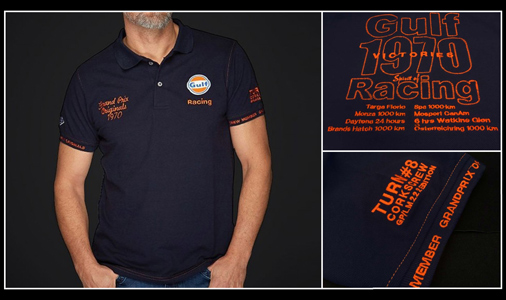Polo homme Gulf Laguna Seca Corkscrew Surpiqûres matelassée sur les épaules - Couleur bleu marine / orange Broderie au dos - Matière 65% coton / 35% polyester 79,90 € TTC / Incl. Taxes