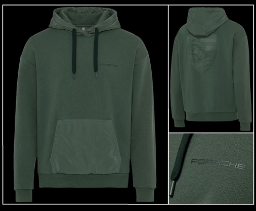 Hoodie mixte Porsche Essential Matière 100% Coton - Capuche réglable - Couleur Vert Chêne Poche kangourou - Alliance bi-matière Porsche WAP202RESS 159,95 € TTC / Incl. Taxes