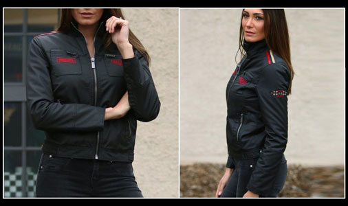 Veste Femme - Gulf Washed Coupe moulante et esprit racing, aspect cuir Bandes cuir bicolore sur les épaules Couleur noir / bandes rouge et beige Matière 100 % coton prélavé Doublure 100% nylon