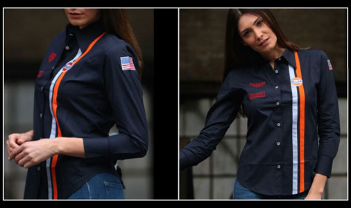 Chemisier Femme - Gulf Vintage Style compétition inspiré de Steve McQueen et du film Le Mans Coupe sportive près du corps Bandes réfléchissantes sur les coutures des épaules Couleur bleu marine / bandes orange et bleu Gulf Matière 100 % coton