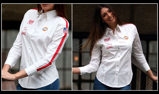 Chemisier Femme - Gulf Vintage Style compétition inspiré de Steve McQueen et du film Le Mans Coupe sportive près du corps Bandes réfléchissantes sur les coutures des épaules Couleur blanc / bande rouge sur les manches Matière 100 % coton