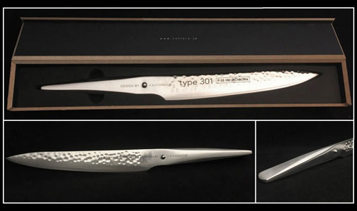 Couteau Porsche Design Type 301 - Sujihiki - Lame 19,3 cm Design exclusif issu du Studio F. A. Porsche Acier japonais 0.7% de carbone + molybdène vanadium Martelage anti-adherent de la lame Manche ergonomique en inox Aiguisage ambidextre Longueur 30.9 cm Poids 172 g Chroma P05HM Garantie 5 ans 105,95 € TTC / Incl. Taxes