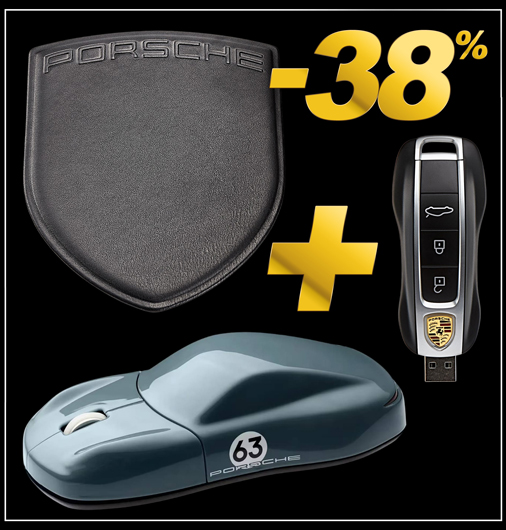 Trio Souris sans fil + Tapis de Souris + Clé USB Porsche Souris sans fil Porsche 911 60 ans pour PC et Mac - 2 boutons - 1 molette tridirectionnelle Tapis de Souris Porsche 100% Cuir - Dimensions 24 x 18.9 x 0.5 cm Clé USB Porsche 64 GO - Prise USB rétractable Porsche WAP0508140R060 + WAP050020MPAD + WAP0507150M001