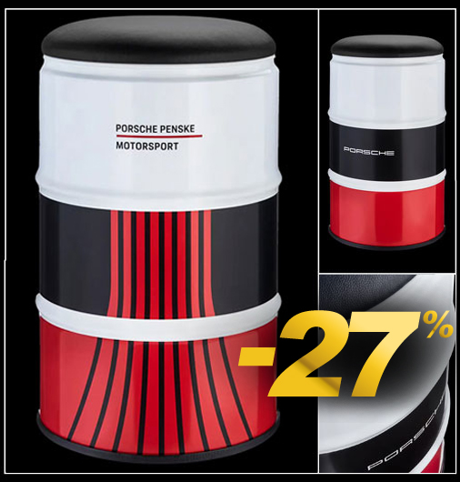 Siège Porsche 963 Penske Motorsport Réplique d'un baril de pétrole - Utilisation en intérieur ou en extérieur Assise rembourrée - Revêtement simili cuir - Tonneau en métal Hauteur 60 cm - Diamètre 40 cm - Poids 10 kg Made in Germany - Porche WAP0501080RLMD