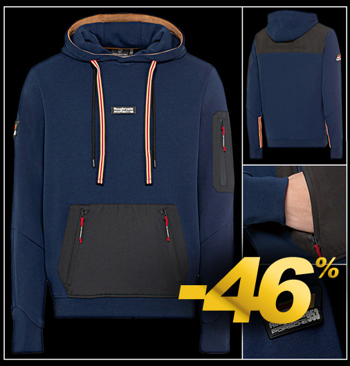 Hoodie homme Porsche 953 Roughroads Matière 78% Coton / 22% Polyester - Couleur Bleu indigo - Poche kangourou Capuche réglable par cordon - Poche zippée sur la manche gauche Fermetures zip imperméables - Badge en caoutchouc Porsche WAP160PRRD