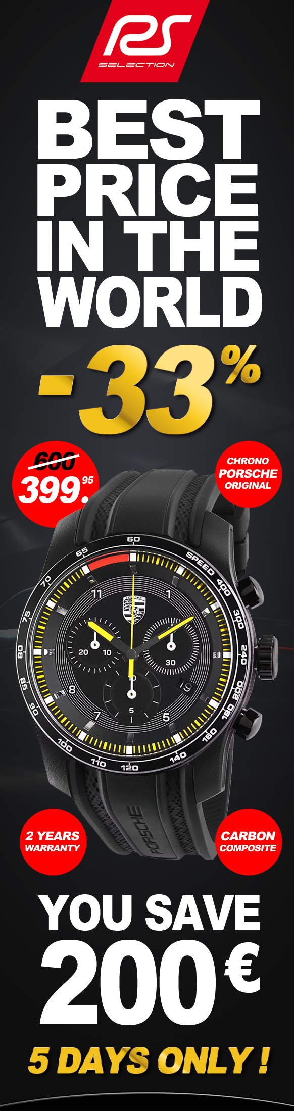 Montre Porsche Chronographe Carbon Composite Mouvement Suisse RONDA 13 rubis - Boîtier en alliage carbone avec finition satinée Bracelet caoutchouc 22 mm - Verre saphir traité antireflets - Guichet de date à 4 heures Fonction d'arrêt intégrée - Dos gravé avec numéro de série - Etanche à 50 mètres / 5 ATM Diamètre 42 mm - Epaisseur 12 mm - Garantie 2 ans Porsche WAP0700050MCRB |
