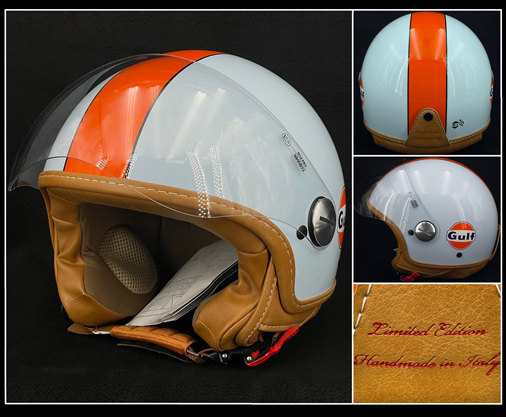 Casque Gulf Jet avec visière Jet 01 Coque 100% polycarbonate - Doublure Terinda avec cuir écologique Visière couvrante 100% transparente - Housse de transport nylon noire Fermeture par boucle double - Couleur Bleu / Bande Orange Certification CE pour utilisation sur la route (hors U.S.A.) Made in Italy - Edition limitée