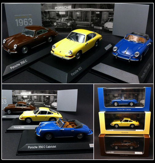 Trio 356 C + 356 Cabriolet + 901 Coupé 1963 Brun Togo / Bleu ciel / Jaune champagne 1/43 - Minichamps WAP0203560H + WAP0205500H + WAP0209110H Edition limitée - 1963 exemplaires numérotés