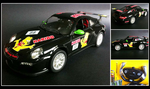 997 GT3 RS n°8 Haribo Radiocommandée - 27MHz Noir / Vert 1 : 14 Nécessite 1 pile 9V et 5 piles 1.5V AA non-fournies