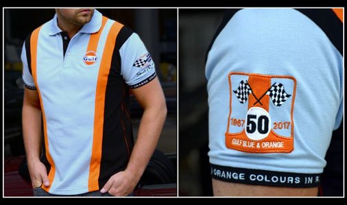 Polo Homme Gulf Racing Team - 50e Anniversaire Matériel : 65% coton, 35% polyester Couleur: bleu Gulf / orange / noir Broderie tout autour du col