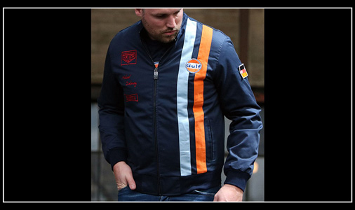 Veste homme Gulf - Steve McQueen Le Mans Avec 5 drapeaux brodés interchangeables en haut de manche Matériel 100% Coton - Doublure intérieure 100% Nylon Couleur : bleu indigo