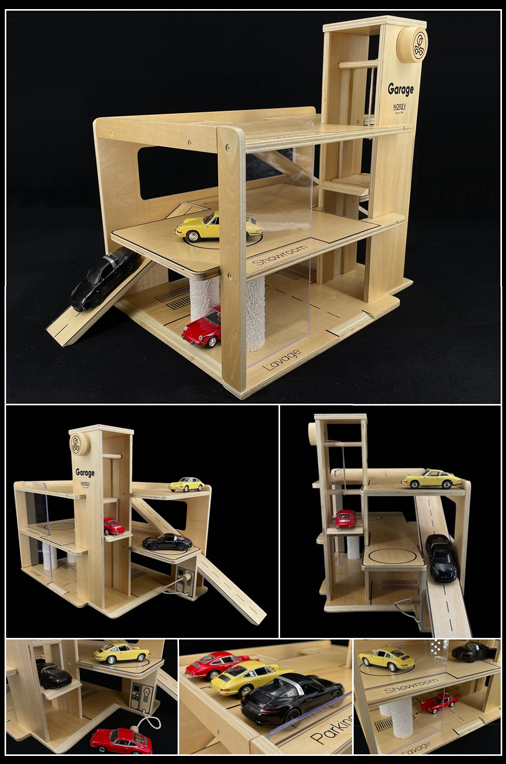 Magnifique Garage en bois à monter soi-même Parfait pour mettre en valeur vos modèles préférés au 1/43 1 miniature VW Golf 1/43 incluse - Miniatures Porsche non incluses Station de lavage avec rouleaux - Station service Ascenseur pour voitures - 2 rampes d’accès aux niveaux supérieurs Dimensions 66x36x28 cm - Norev G43010